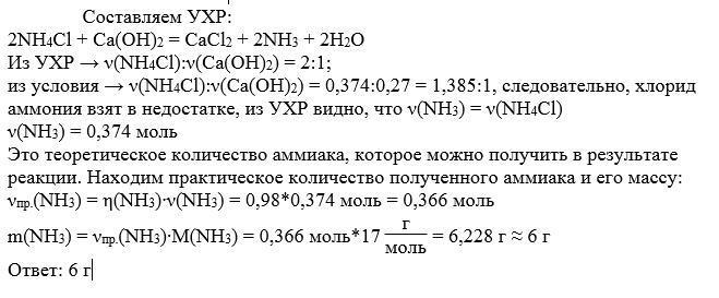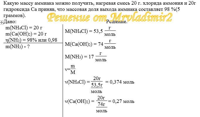 Какую массу аммиака можно получить, нагревая смесь 20 г. хлорида аммония и 20г гидроксида Ca приняв, что массовая доля выхода аммиака составляет 98 %(5 граммов)