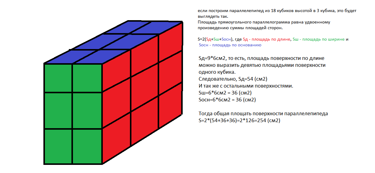 Из 18 одинаковых кубиков сложили прямоугольный параллелепипед высотой три кубика. Найдите площадь поверхности параллелепипеда, если площадь поверхности одного кубика равна 6 см2.