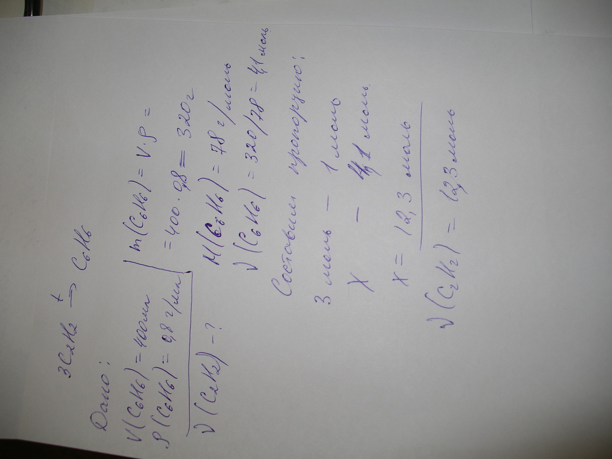 Рассчитайте количество вещества ацетилена,который потребуется для получения 400мл бензола(плотность 0,8г/мл). Решите пожалуйста. ООчень надо.