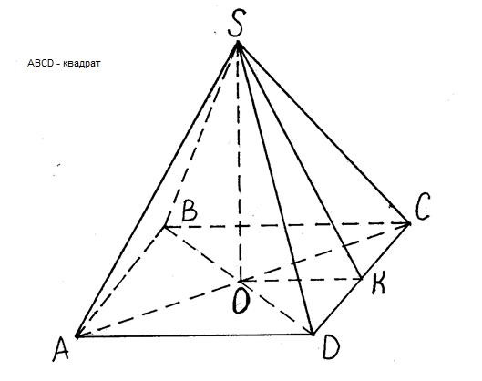 В правильной четырехугольной пирамиде SABCD в основании - квадрат ABCD, а вершина S проецируется в центр основания O. Значит ОК=ВС/2=4/2=2.