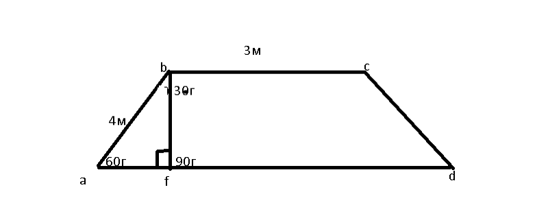 В равнобедренной трапеции диагонали пересекаются под углом 60° Найти диагонали и нижнее основание трапеции, если верхнее основание 3 м, а боковая сторона трапеции 4 м.