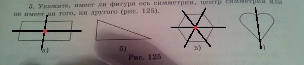 а) имеет 2 оси симметрии и центр симметрии (отмечено красной точкой)