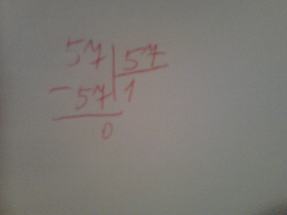 Пишешь 57(пусть это будет 57!) разделить на 57(столбиком),Над 57(!) проводишь дугу,и смотришь.В 57 число 57 помещается один раз.Значит пишешь (под 57) 1,а под 57(!) пишешь минус 57.Проводишь черту и пишешь 0