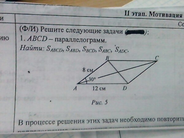 S(ABCD)=1/2 AD* H. Из вершиныВ опустим перпендикуляр на нижнее основание- это Н Образовался прямоугольный треугольник,В котором гипотенуза равна 8см,,а высота лежит против угла в 30 градусов,значит равна половине гипотенузы. Н=4. Тогда подставляем в формулу S-1/2*12*4=24