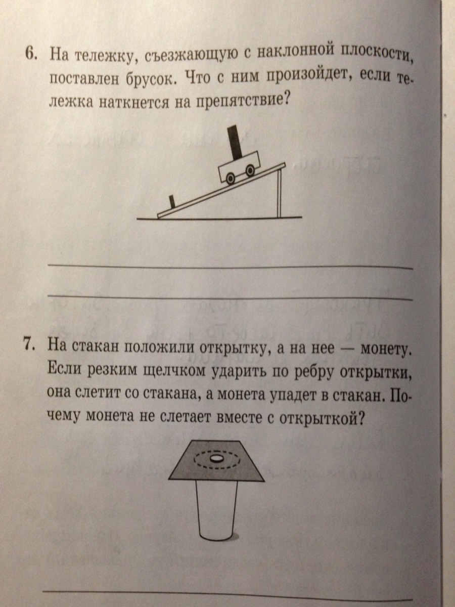 7.Если резким щелчком ударить открытку из под стакана,она устремится в ту сторону куда была направлена сила удара. Монетка находящаяся на открытке,будет стремиться сохранить свое положение(в силу инертности и инерции),и как следствие монетка упадет в стакан с водой.