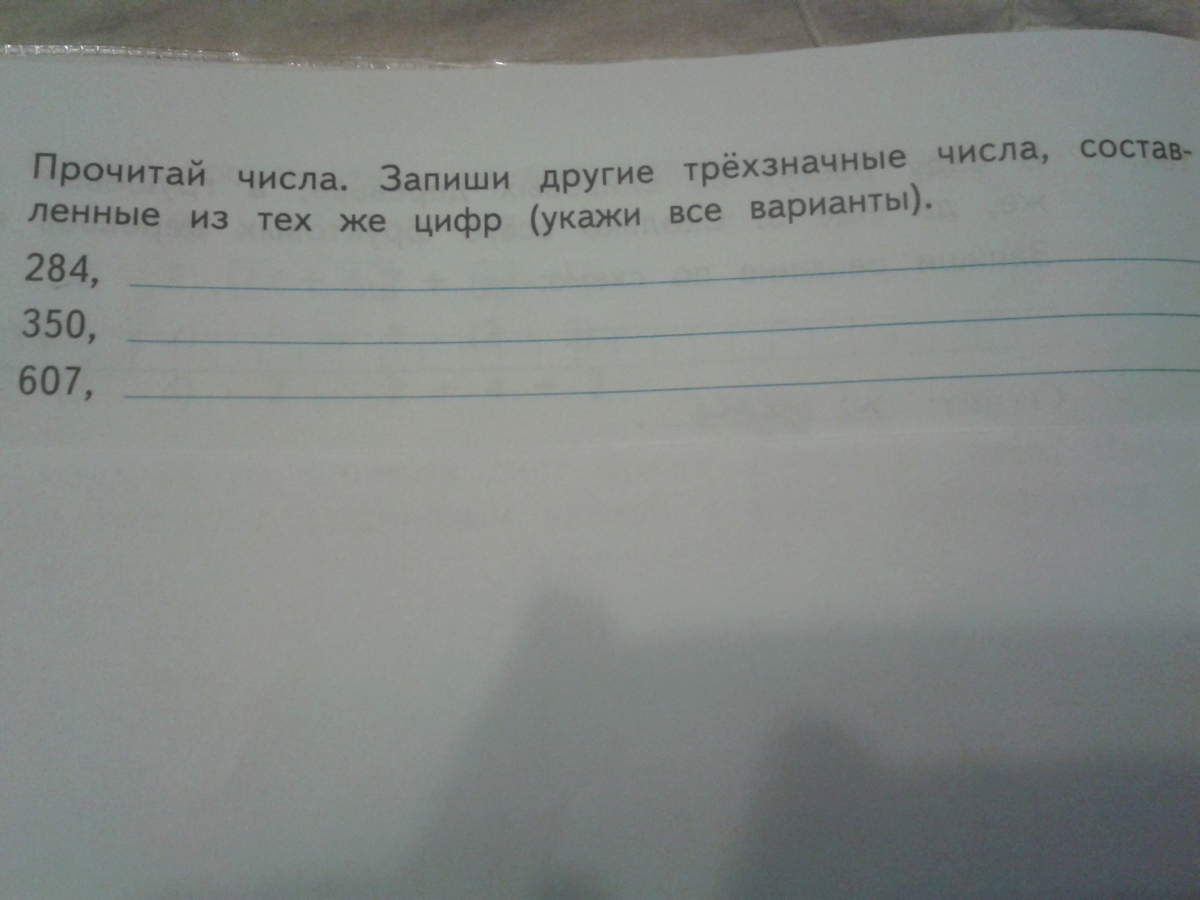 помогите пожалуйста прочитай числа запиши другие трёхзначные числа составленные из тех же цифр укажи все варианты 284. 350. 607