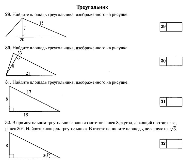 Площадь в любом треугольнике равна половине произведения какой-либо (любой) стороны треугольника на высоту, опущенную на эту сторону. Таким образом, в задаче 29 площадь S = 20*7/2 = 70 квадратных единиц, в которых даны стороны треугольника. В каких не ясно. Могут быть миллиметры, сантиметры и т.д.