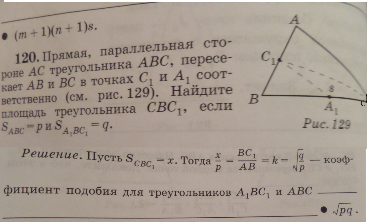 Scbc1 = Sa1bc1 * CB/BA1 = q * CB/BA1 = q * корень(p/q) = корень(p*q) - это ответ