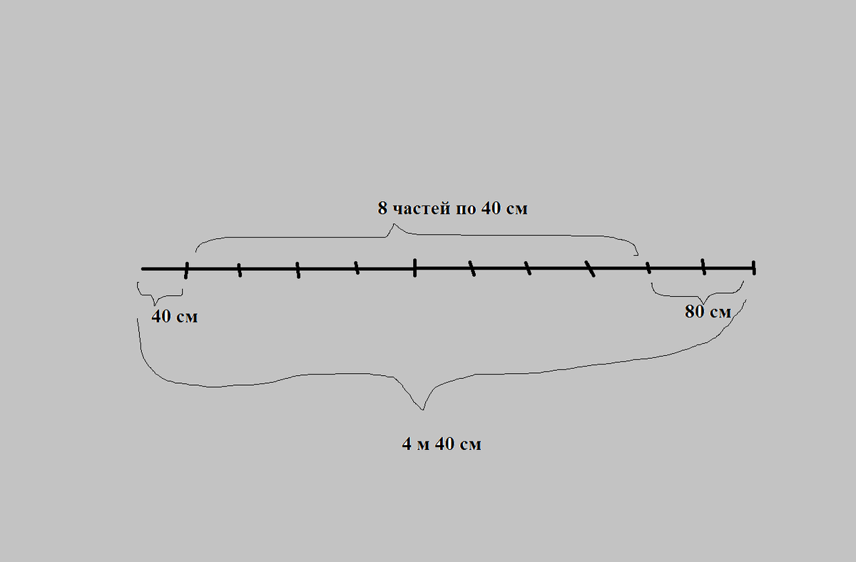 с одного конца ленты длиной 4м 40 см отрезали 80 см а с другого конца 40 см.оставшуюся часть ленты поделили на 8 равных частей.найди длину одной части.сделай рисунок к задаче.