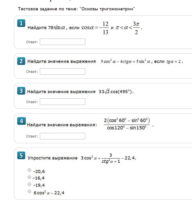 5)3cos²a+3:1/sin²a -22,4=3cos²a+3sin²a-22,4=3(cos²a+sin²a)-22,4=3-22,4=-19,4