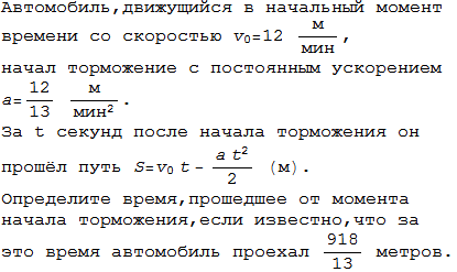 V₀ =12м/мин;a=12/13м/мин²;S=918/13 м.