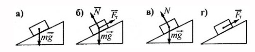 Тело скользит по наклонной плоскости вниз. Силы, действующие на тело, правильно изображены на рисунке: