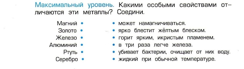 1. Магний -горит ярким пламенем, золото -блестит желтым блеском, железо -намагничивается, алюминий -в три раза легче железа, ртуть -жидкий при обычной темп., серебро -убивает бактерии
