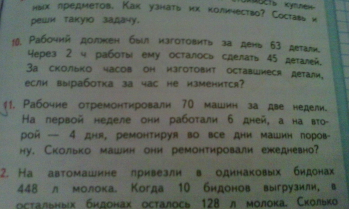 пусть Х машин рабочие ремонтировали за день, тогда 6Х + 4Х =70 10 Х = 70 Х = 7 машин рабочие ремонтировали в день 7 х 6 = 42 маш. отремонтировали за первую неделю 7 х 4 = 28 машин отремонтировали за вторую неделю. Ответ:7 машин рабочие ремонтировали ежедневно. .