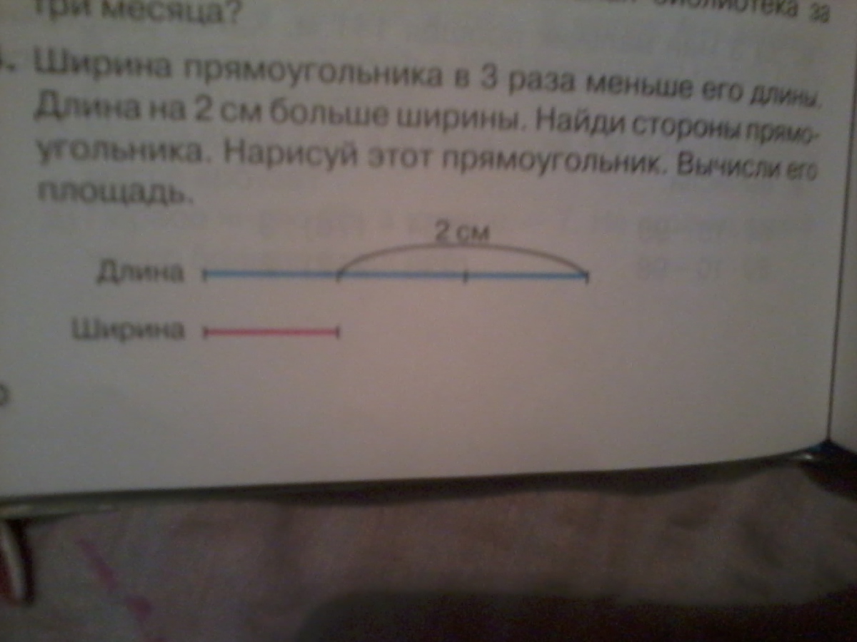 Ширина прямоугольника в з раза меньше его длинны. Длинна на 2 см больше ширины. Найди стороны прямоугольника. Нарисуй этот прямоугольник. Вычисли его площадь.