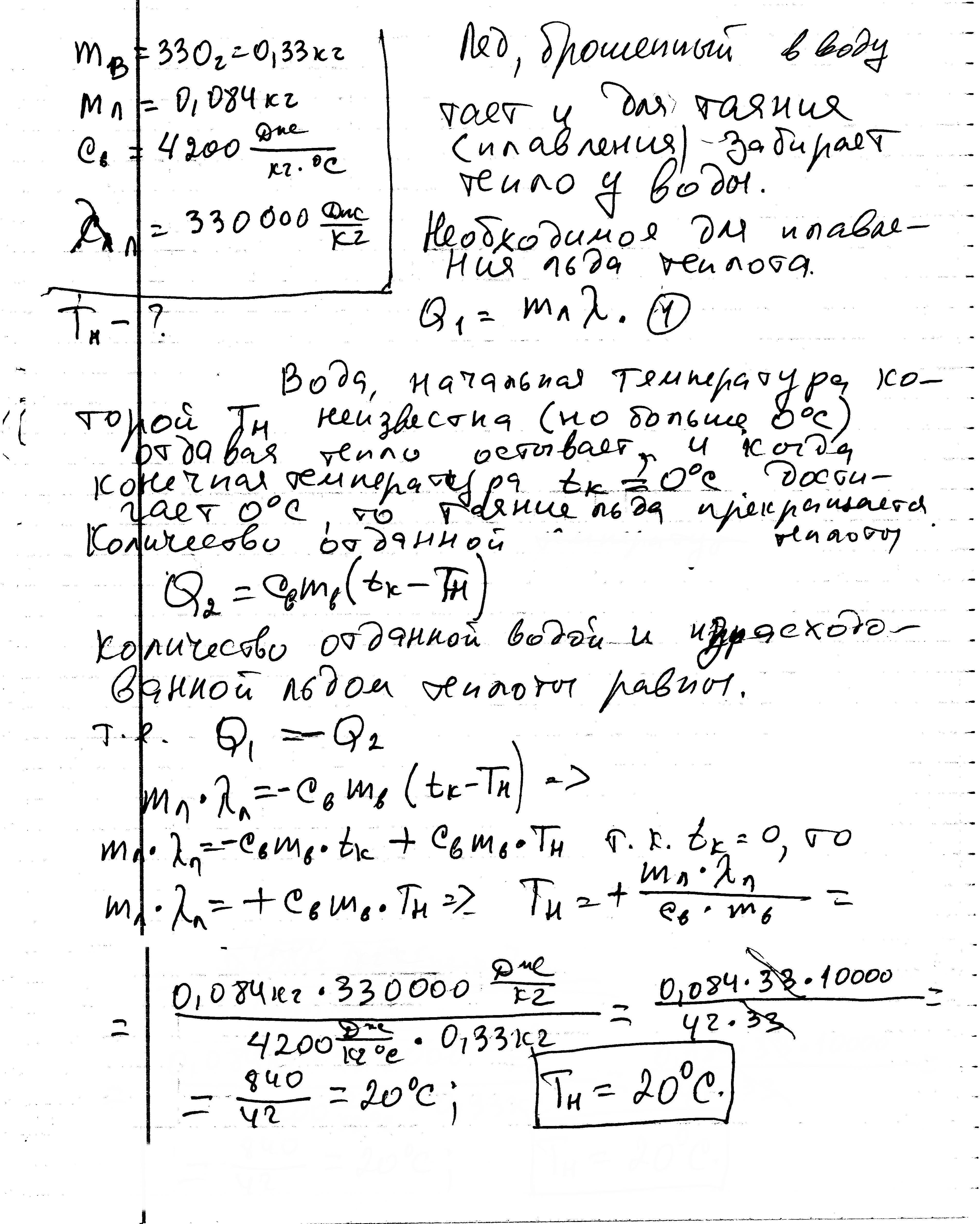В калориметр с водой бросают кусочки тающего льда. В некоторый момент кусочки льда перестают таять. Первоначальная масса воды в сосуде 330 г, а в конце процесса масса воды увеличивается на 84 г. Какой была начальная температура воды в калориметре? Удельная теплоемкость воды 4200 Дж/(кг•°С), удельная теплота плавления льда 330 кДж/кг.