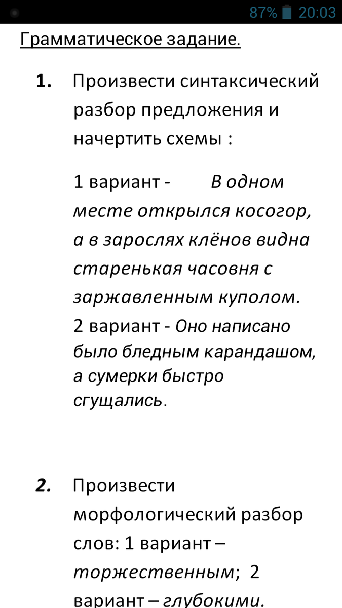 В 2. Повест.. невоскл.. сложное, союзное, сложносочиненное с сочинительным союзом и , из двух частей. 1. Двусостав.. распр. Оно написано было - основа - = . Бледным - определ. 9 волнистой линией подчеркнуть). Карандашом - дополн. -----. 3. Двусост.. распр. Сумерки сгущались - основа - =. Быстро - обстоятельство -.-.-.-.