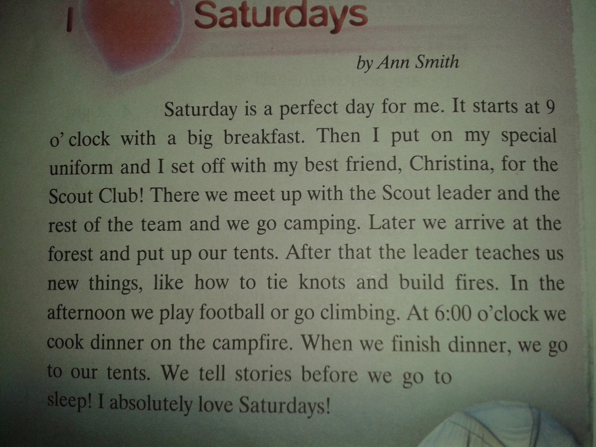 Суббота - прекрасный день для меня. Он начинается в 9 часов с большого завтрака. После я одеваю свою специальную униформу, и отправляюсь со своим лучшим другом, Кристиной, в Скаут клуб! Там мы встречаемся с руководителей отряда бойскаутов и остальной частью команды, и мы отправляемся в поход. Позже мы достигаем леса и ставим наши палатки. После этого руководитель преподает нам новые вещи, как то: как связать узлы и построить огни. Днем мы играем в футбол или занимаемся альпинизмом. В 6:00 мы готовим ужин на походном костре. Когда мы заканчиваем ужин, мы идем в наши палатки. Мы рассказываем истории, перед тем, как мы заснем! Я абсолютно люблю субботы!