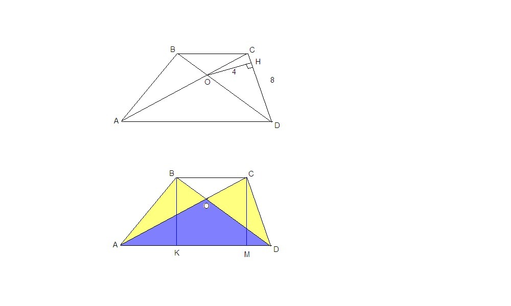 В трапеции abcd с основаниями ad и bc диагонали пересекаются в точке о ,которая удалена от прямой cd на 4 см.Найдите площадь треугольника aob,если cd =8 см
