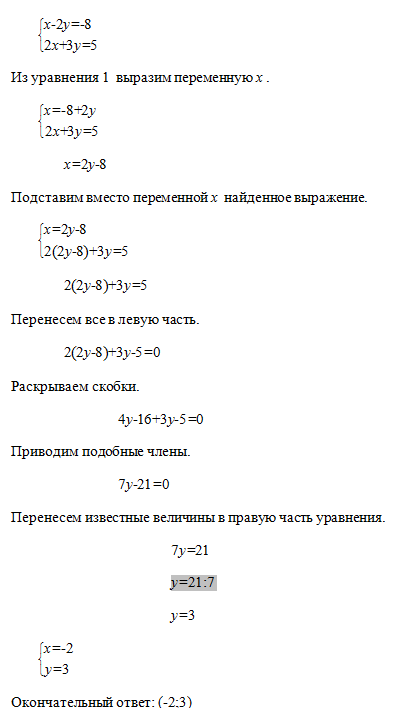 Теперь подставляем в любое выражение. Я взял (2x+3y=5).