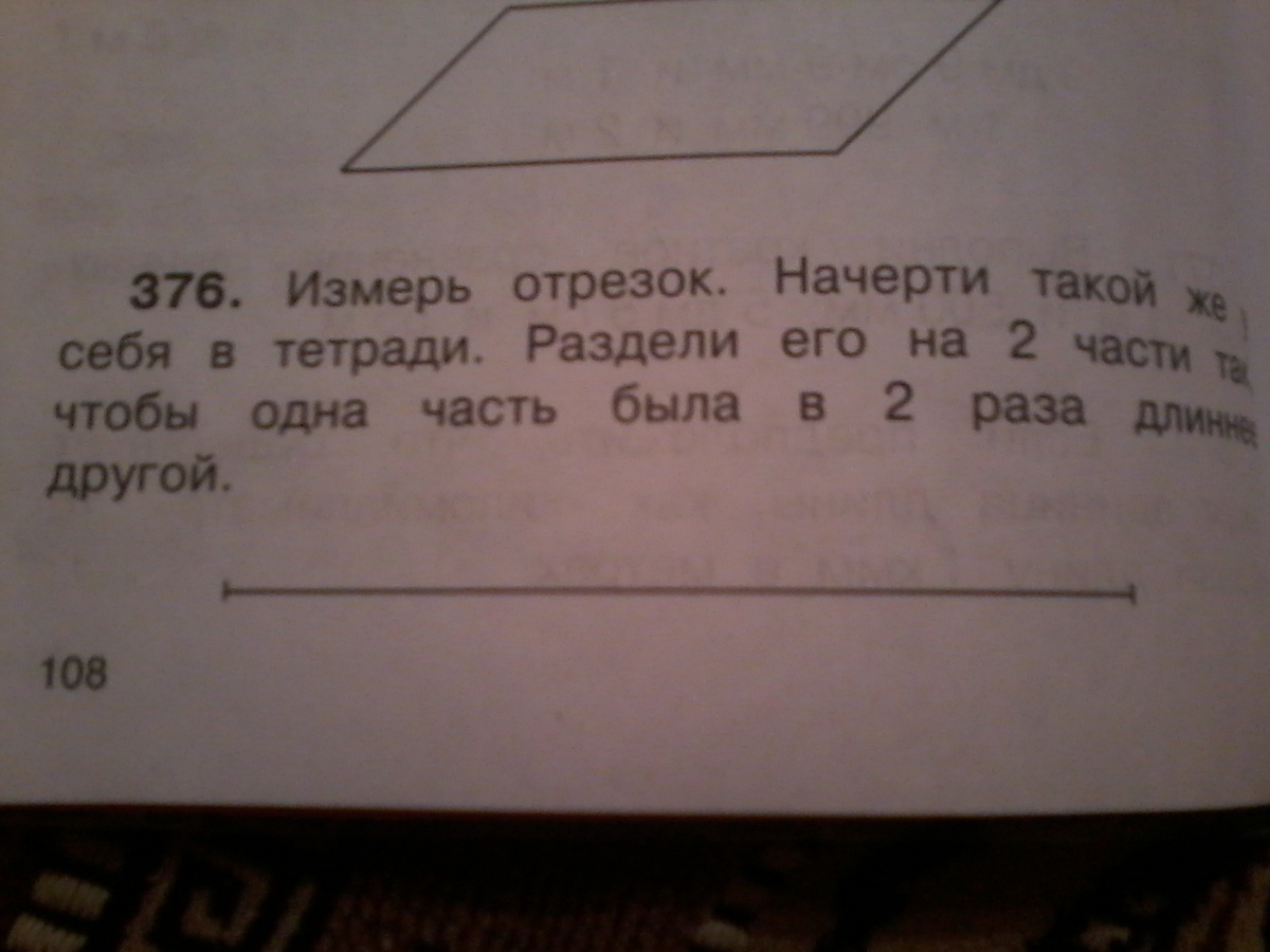 Помогите плиз(Измерь отрезок.Начерти такой же у себя в тетради.Раздели его на 2 части так,чтобы одна часть была в 2 раза длинее другой.Отрезок равен:8 см 9мм