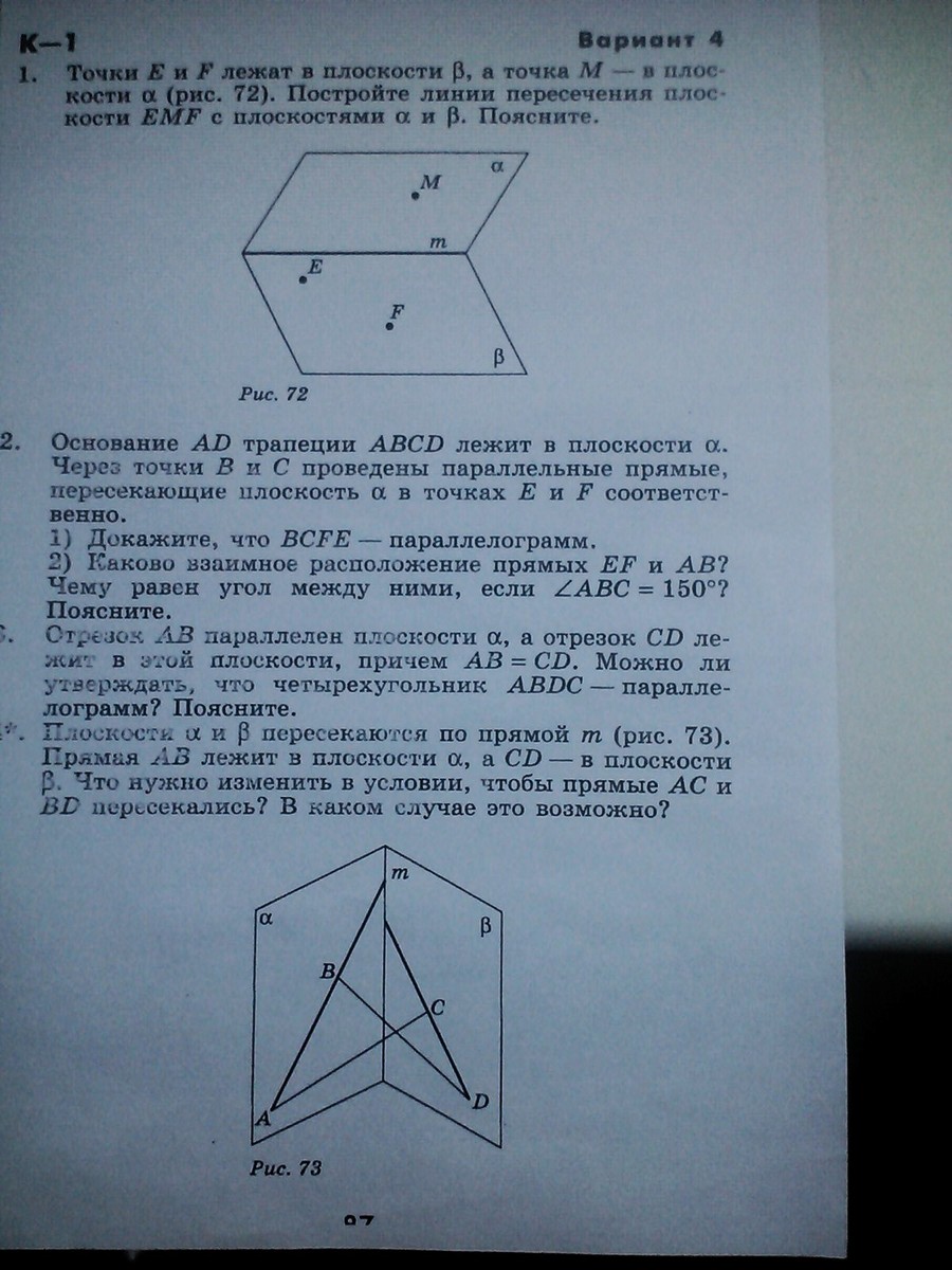 4.)это возможно если прямые AB и CD будут пересекаться и точка их пересечения будет принадлежать прямой m, тогда эти две пересекающиеся прямые зададут ещё одну плоскость, в которой будут лежать прямые AC и BD, т.к. они не параллельны они пересекаются.