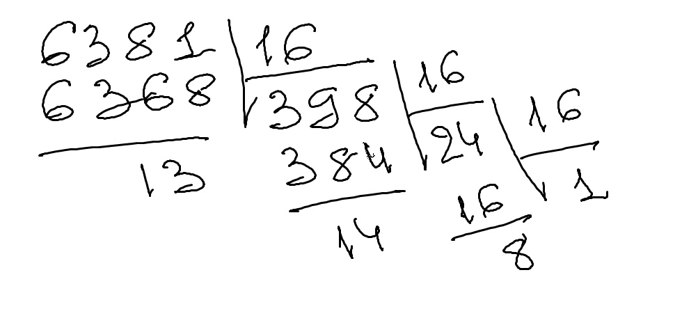 шестнадцатиричное число записывается по остатку с конца. в шестнадцатиричной системе 10=A, 11=B, 12=C, 13=D, 14=E, 15=F.