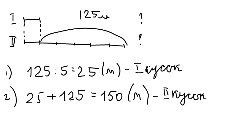 По чертежу видно, что 125м составляет 5 частей. Находим, чему равна 1 часть. Это и есть длина первого куска. Потом находим длину второго куска. Подробнее смотри прикрепленный рисунок.