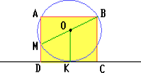 Пусть A и B — вершины квадрата ABCD, лежащие на окружности радиуса R и центром O, D и C — на касательной, проведённой к окружности в точке K, M — точка пересечения окружности со стороной AD. Поскольку BAM = 90o, то MB — диаметр окружности, а т.к. OK — средняя линия трапеции MDCB, то = OK.
