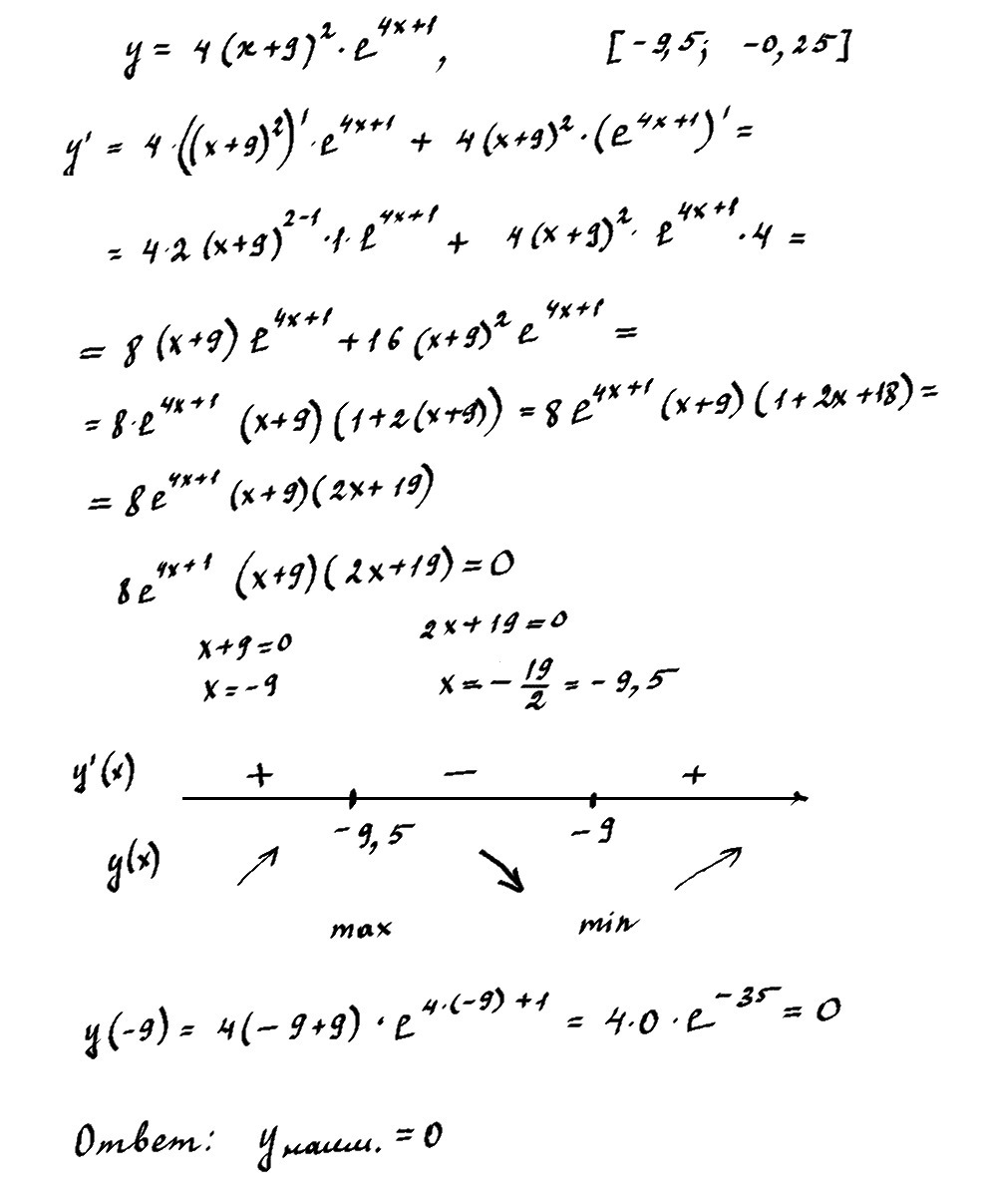 найти наименьшее значение функции y= 4(x+9)^2*e^(4x+1) на отрезке [-9.5;-0.25]