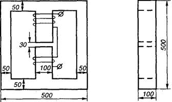 Определить ток в катушках и магнитное напряжение в воздушном зазоре, если магнитная индукция в крайних стержнях магнитопровода В = 1,6 Тл. Длина воздушного зазора lзаз = 30 мм. Размеры магнитопровода даны на рис. 4 в мм. Потоком рассеяния пренебречь.