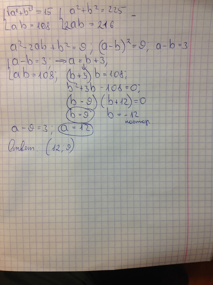 если нужно могу расписать решения системы, а так ответ: a = 12; b = 9;