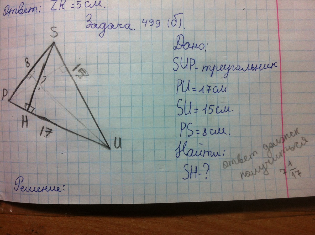 Пусть сторона НР = х см, тогда UH=(17-x) см, тогда см. Выразим высоту из каждого из получившихся прямоугольных треугольников по т Пифагора, получим: