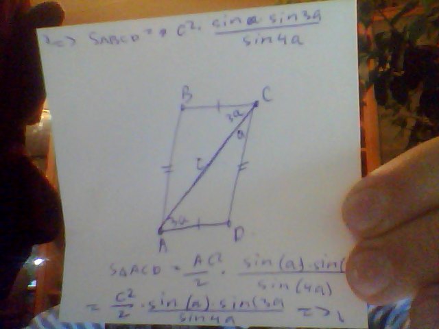В параллелограмме АВСD диагональ АС разбивает угол С на 2 угла a и 3a, АС=с. Найдите площадь параллелограмма АВСD,