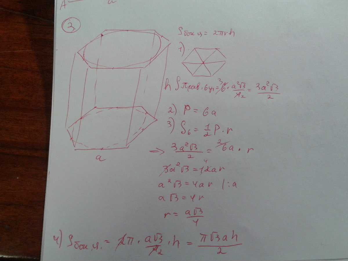3.Найдите площадь боковой поверхности цилиндра,вписанного в правильную шести угольную призму,сторона основания которой равна а,а боковое ребро h.