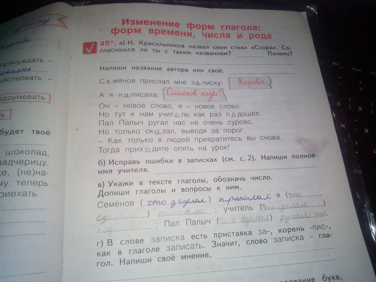 в)я(что сделала?)написала ед.ч.,учитель(что сделал?)подошёл ед.ч.,Пал Палыч(что делал?)ругал ед.ч.
