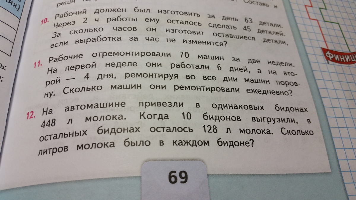 11)70/(6+4)=7(м)делают ежедневно 12)(448-128)/10=32(л)в одном бидоне