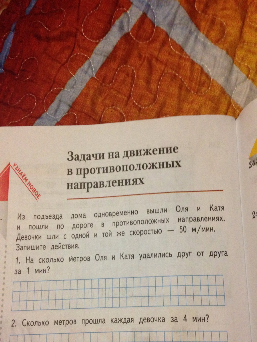 1) Каждая из девочек шла со скоростью 50 м/мин., шли они в противоположные стороны, значит, расстояние между ними становилось все больше и больше: