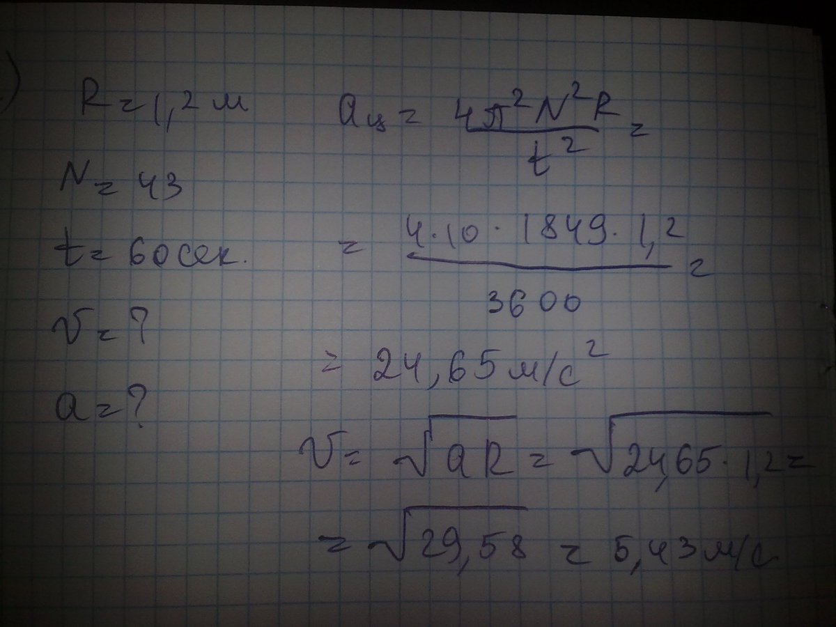 диусом 1,2 м делает 43 оборота в минуту. Определите линейную скорость и центростремительное ускорение.