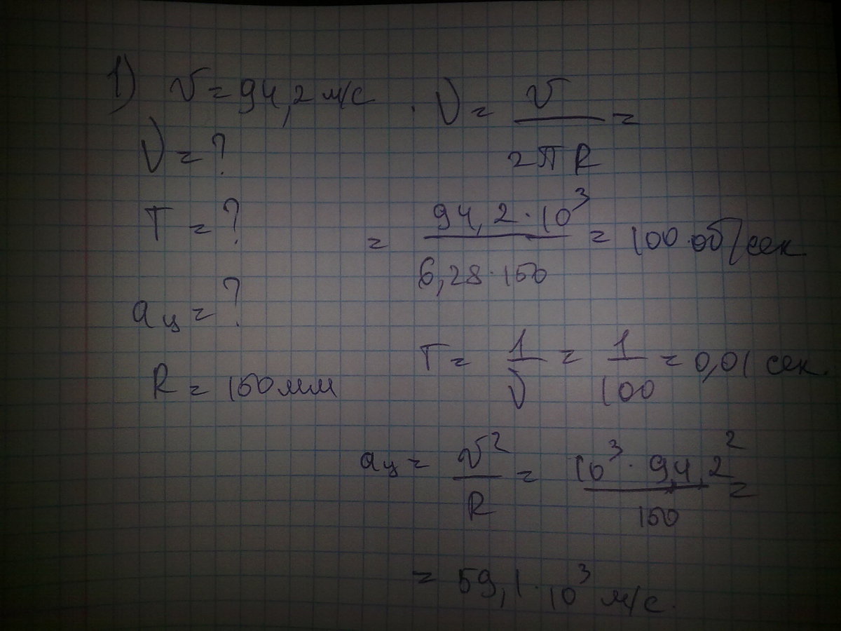 1. Скорость крайних точек абразивного круга 94,2 мс. Определите число оборотов в секунду, период вращения и центростремительное ускорение этого круга если диаметр составляет 300 мм.