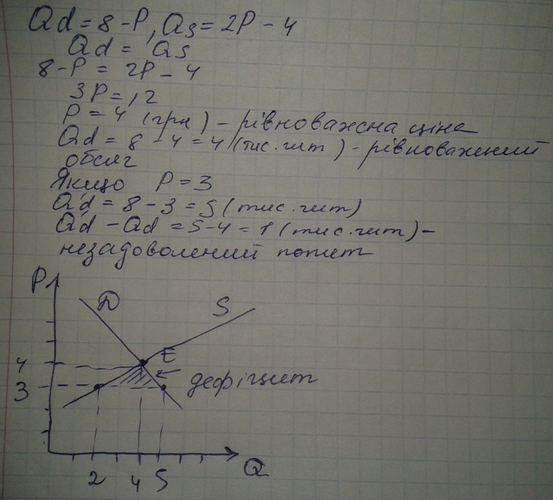 Функції попиту населення на товар задана рівнянням :〖 Q〗_d=8-p; функція пропонування товару:Q_s=2p-4.Обчисліть рівноважну ціну (грн.) і обсяг продажу(тис.шт). Визначте обсяг продажу і величину незадоволеного попиту,якщо ціна товару буде фіксована на рівні 3 грн. за одиницю. Подайте графічну ілюстрацію.