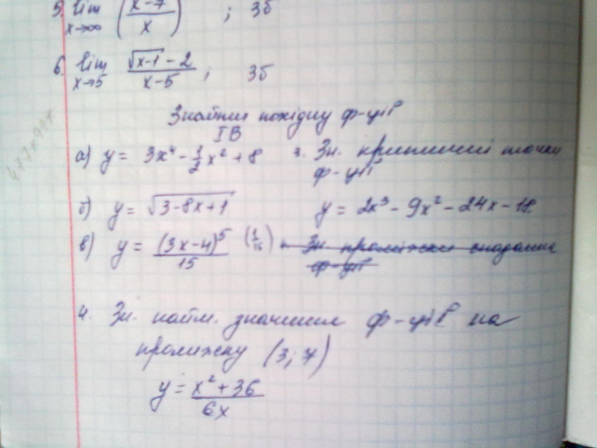 5) lim(x-7)/x=lim(1-7/x)=1-0=1, так как 7: на бесконечность стремится к нулю.