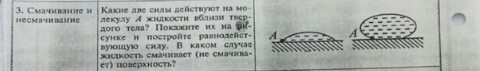 На молекулу действует сила притяжения F1 соседних молекул жидкости, и сила притяжения молекул F2 твердого тела . При F2>F1 жидкость смачивает твердое тело.