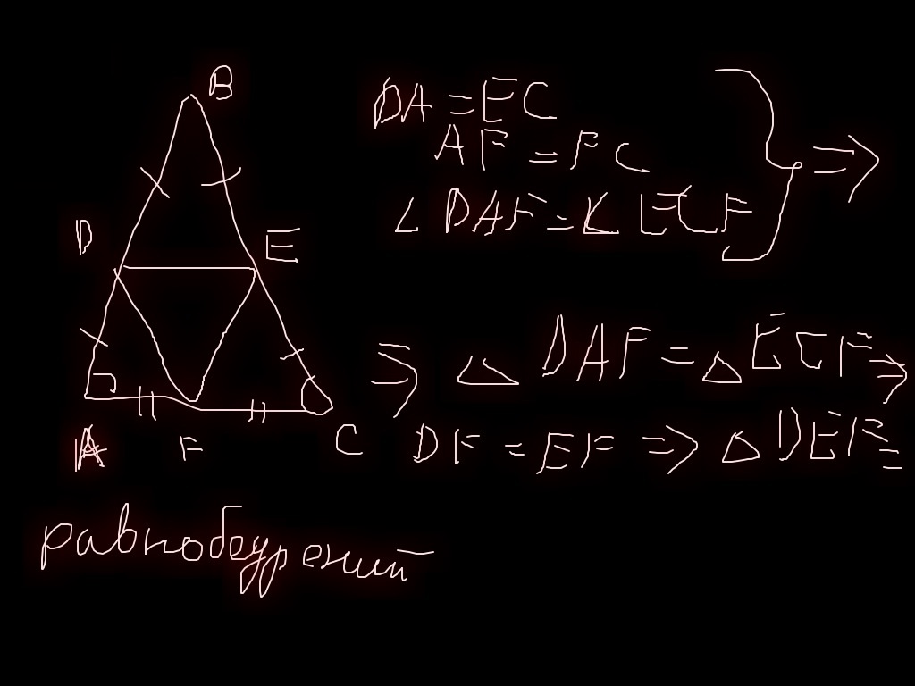 Если соединить середины двух сторон, то получится средняя линия треугольника, равная половине третьей стороны. Точно так же и с остальными двумя соединениями. Таким образом, получается треугольник, составленный из средних линий данного треугольника. Он подобен данному треугольнику с коэффициентом подобия 1/2, то есть каждая его сторона вдвое меньше соответствующей стороны исходного треугольника. Значит, если в исходном треугольнике две стороны были равны между собой, то и в новом треугольнике две соответствующие стороны будут равны друг другу.