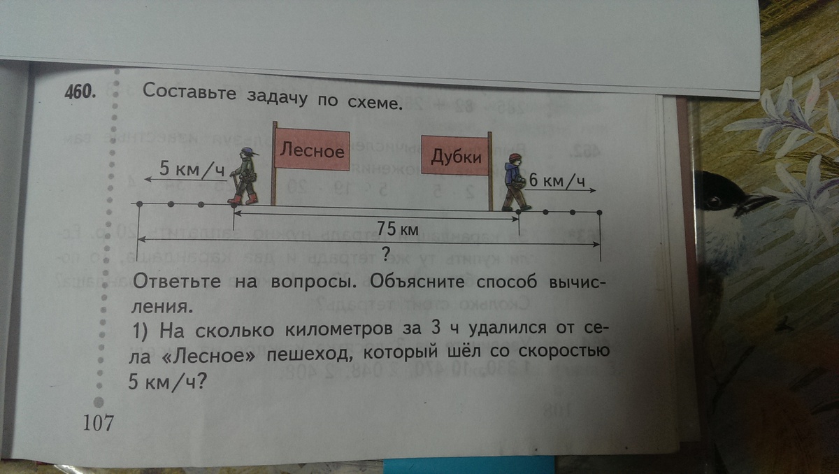 помогите пожалуйста!составьте задачу по схеме.Ответьте на вопросы.Объясните способ вычисления.1)на сколько километров за 3 ч удалился от села "Лесное" пешеход,который шел со скоростью 5 км/ч? 2)на сколько километров за 3 ч удалился от села "Дубки" пешеход,который шел со скоростью 6 км/ч.? 3)Какое расстояние будет между пешеходами через 3 ч? запишите решение задачи. Прочитайте план решения задачи другим способом.1) на сколько километров удалятся пешеходы друг от друга за 1 ч? 2)на сколько километров удалятся пешеходы друг от друга за 3 ч? 3) Какое расстояние будет между ними через 3 ч?запишите решение задачи.