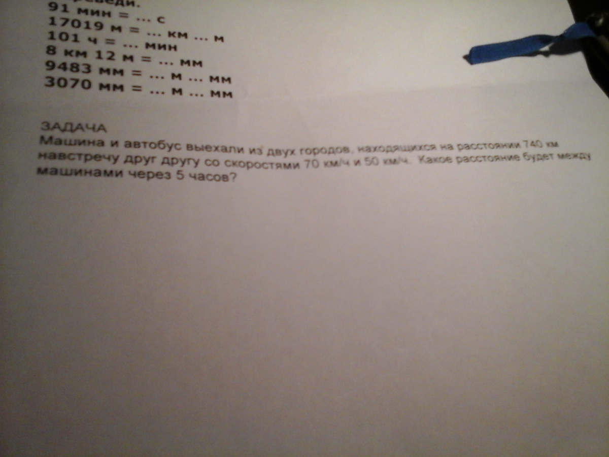 машина и автобус выехали и двух городов находящихся на расстояние 740км на встречку друг другу со скоростами 70км/ч автомоб. и 50км/ч автоб. какое расстояние будет между машинами через 5 часов?