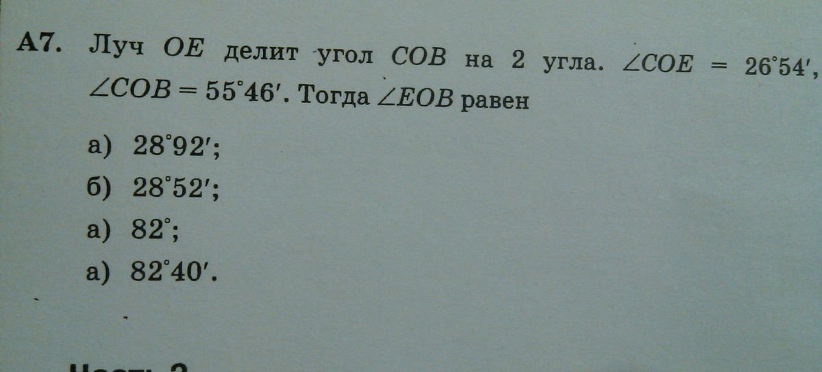 У нас есть угол COB равный 55 градусов 46 милиградусов, он поделен на 2 части, если одна его часть равна 26 градусов 54 милиградуса, чему равна вторая часть?