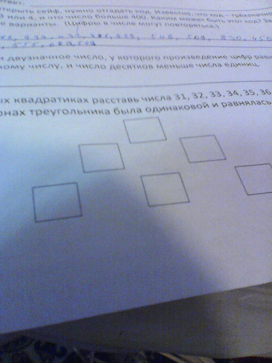 в пустых квадратах расставь числа 31,32, 33, 34, 35, 36 так, чтобы сумма чисел на всех сторонах треугольника была одинаковой и равнялась 100.