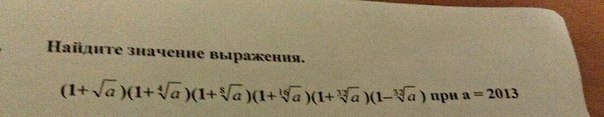 (1+sqrt a)(1+sqrt[4]a)(1+sqrt[8]a)(1+sqrt[16]a)(1+sqrt[32]a)(1-sqrt[32]a)=\=(1+sqrt a)(1+sqrt[4]a)(1+sqrt[8]a)(1+sqrt[16]a)(1-left(sqrt[32]aright)^2)=\=(1+sqrt a)(1+sqrt[4]a)(1+sqrt[8]a)(1+sqrt[16]a)(1-sqrt[16]a)=\=(1+sqrt a)(1+sqrt[4]a)(1+sqrt[8]a)(1-sqrt[8]a)=(1+sqrt a)(1+sqrt[4]a)(1-sqrt[4]a)=\=(1+sqrt a)(1-sqrt a)=1-a\a=2013\1-a=1-2013=-2012