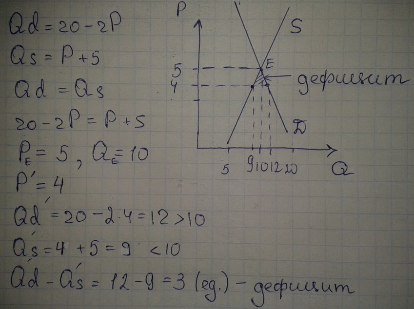 Функция спроса населения на товар Qс=20-2Р, а функция предложения данного товара Qп=Р+5. Предположим, что государство установило фиксированную цену на товар на уровне 4 денежных единиц.
